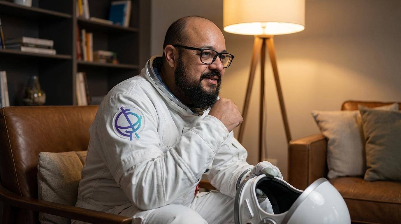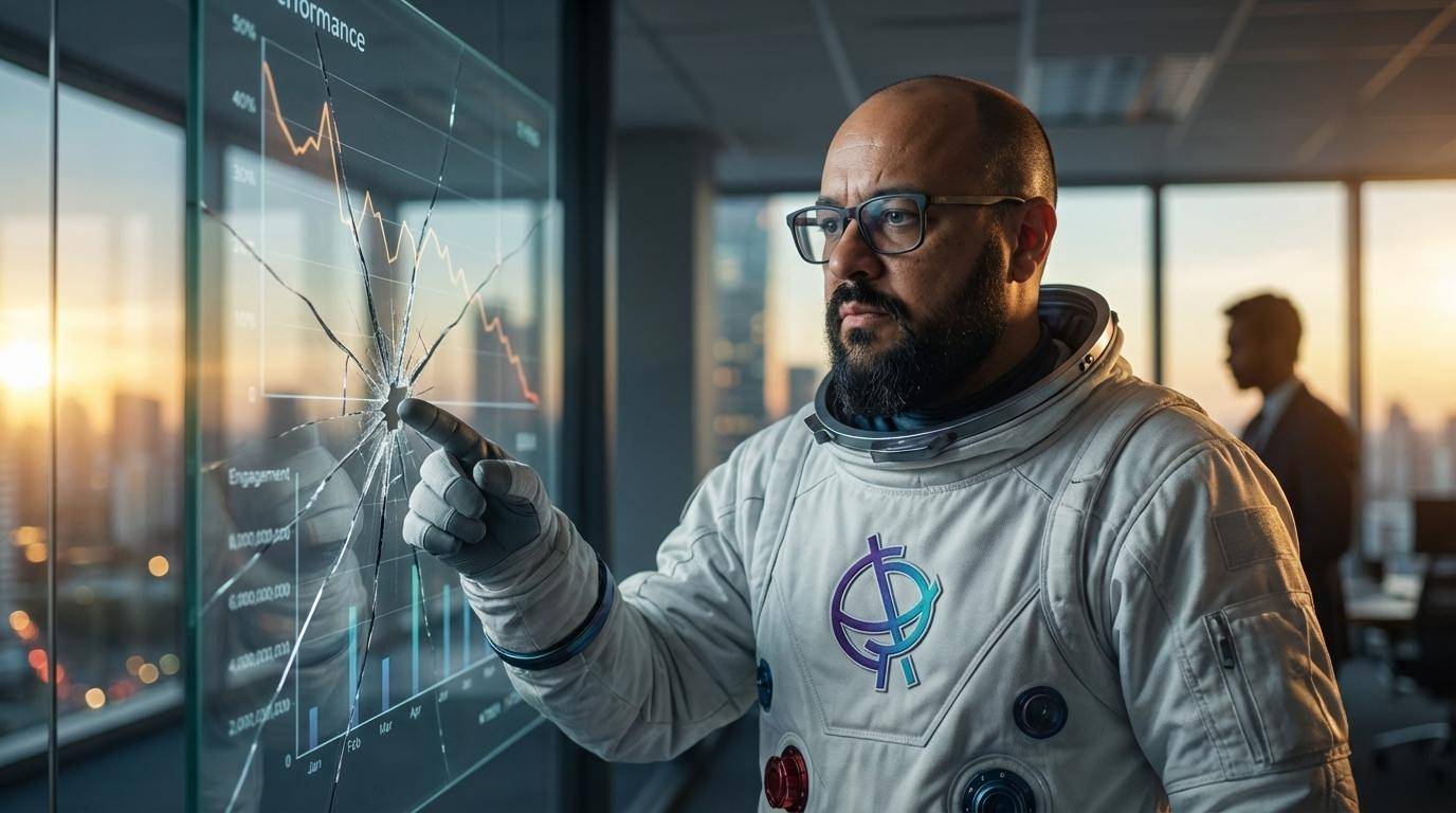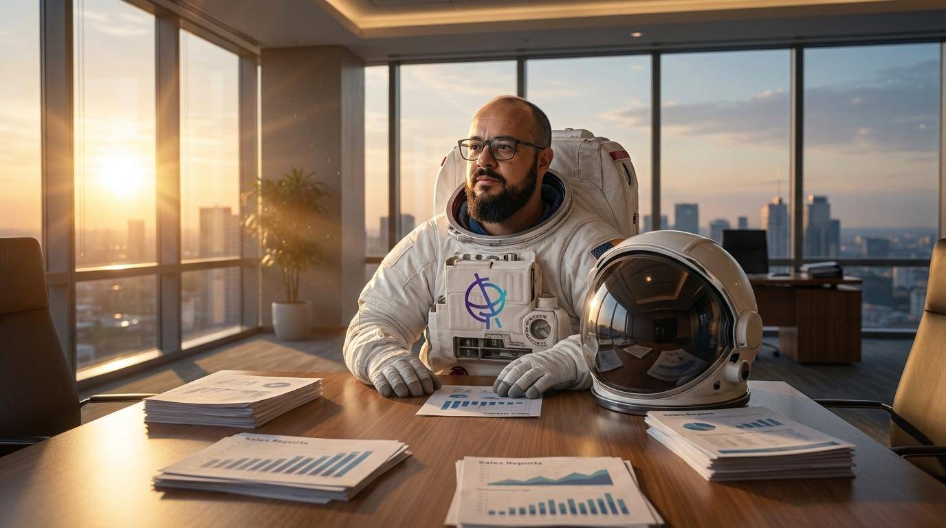 Post do dia. leia e comente. Você vende o presente, eles querem o futuro. Astronauta de óculos e barba, vestindo traje espacial com logotipo, sentado em um escritório. Ele analisa um tablet transparente com gráficos diante de uma janela com pôr do sol. Descubra por que focar no "problema" está te fazendo perder oportunidades cruciais. Astronauta, posso te fazer uma pergunta incômoda? Você tem a melhor das intenções, mas talvez esteja abordando suas conversas mais importantes de forma...