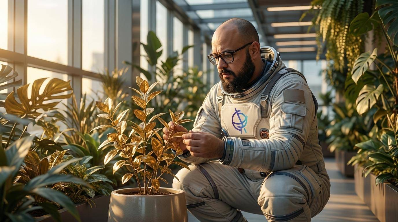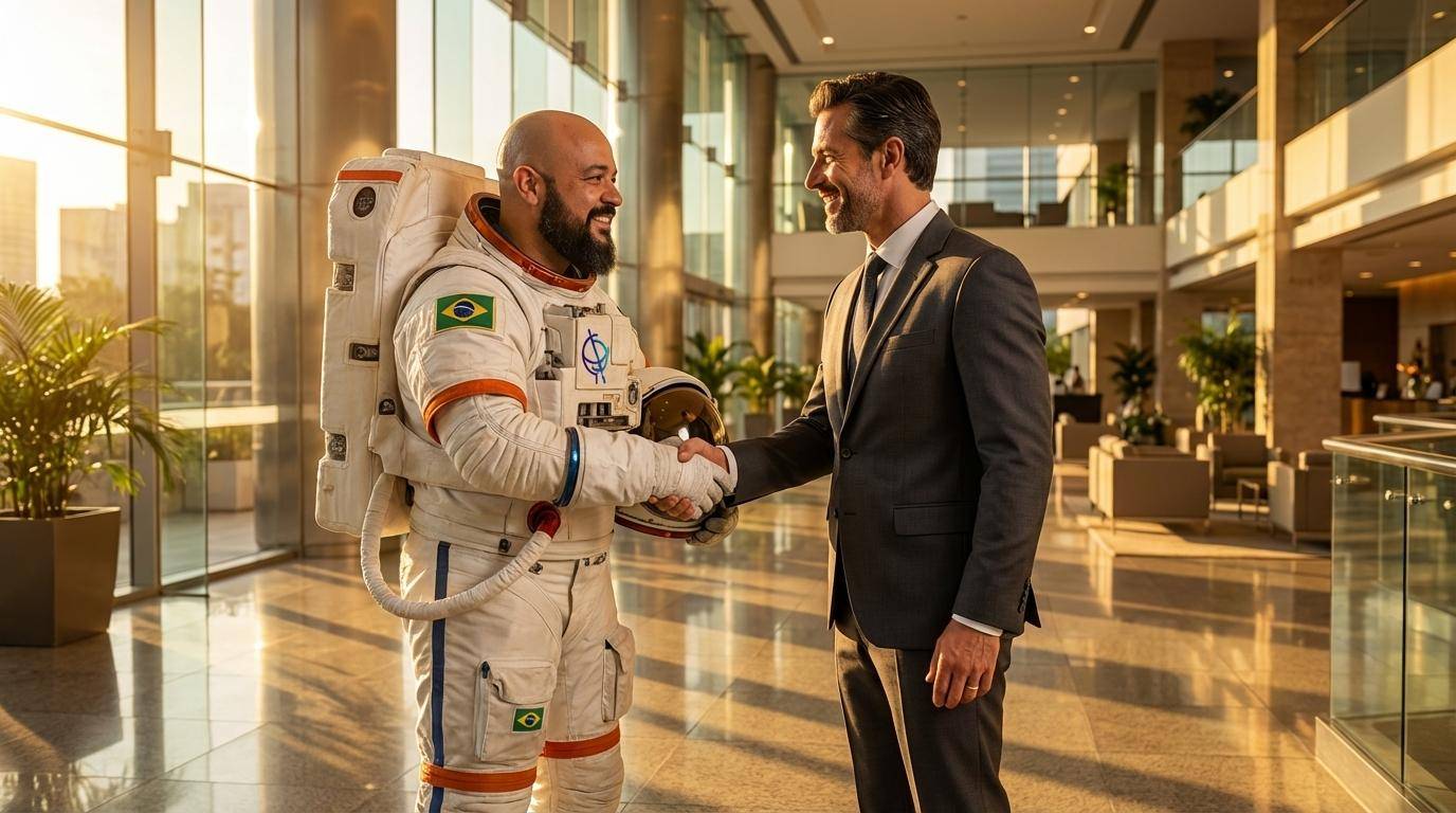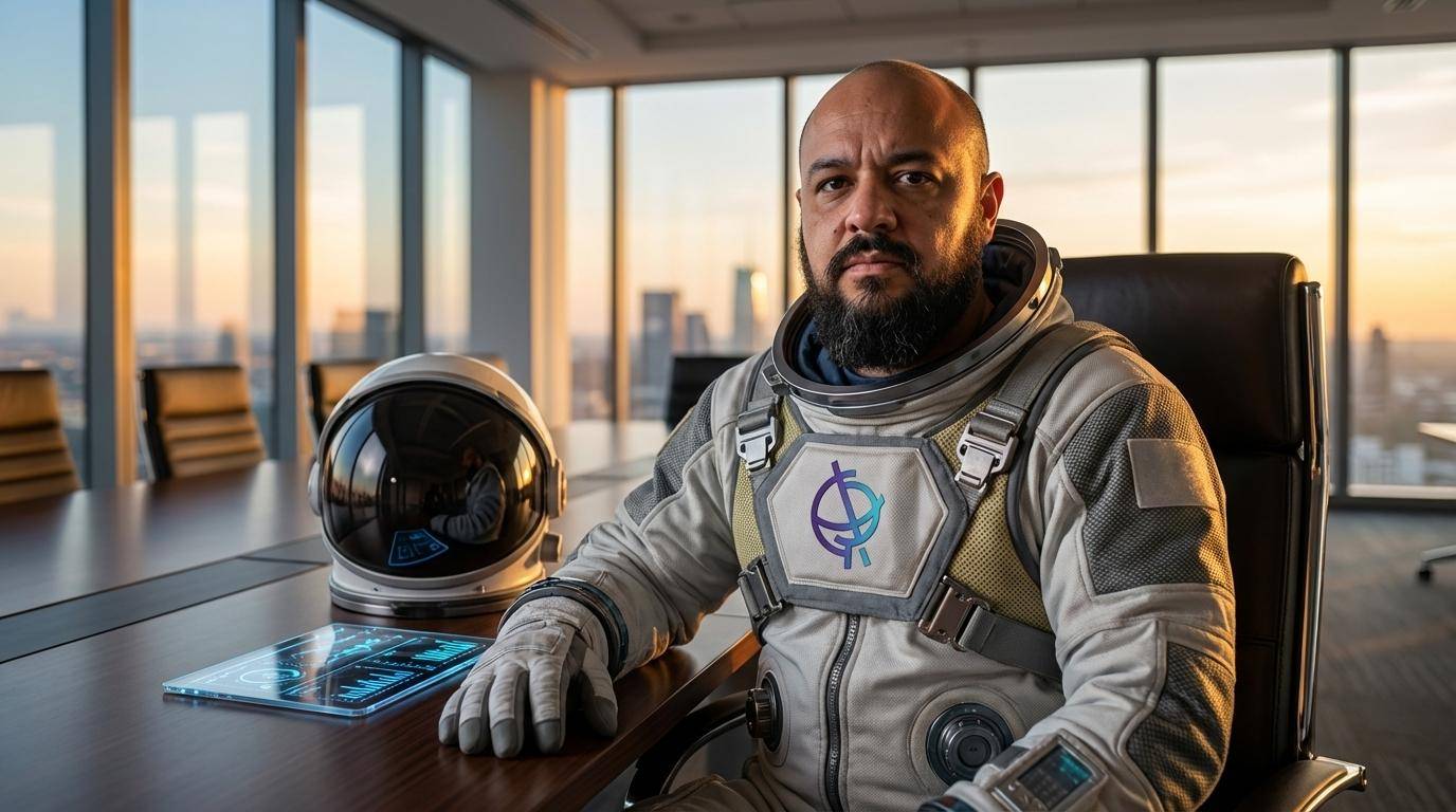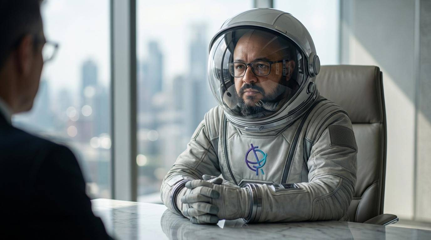 Post do dia. leia e comente. Você vende o presente, eles querem o futuro. Astronauta de óculos e barba, vestindo traje espacial com logotipo, sentado em um escritório. Ele analisa um tablet transparente com gráficos diante de uma janela com pôr do sol. Descubra por que focar no "problema" está te fazendo perder oportunidades cruciais. Astronauta, posso te fazer uma pergunta incômoda? Você tem a melhor das intenções, mas talvez esteja abordando suas conversas mais importantes de forma...